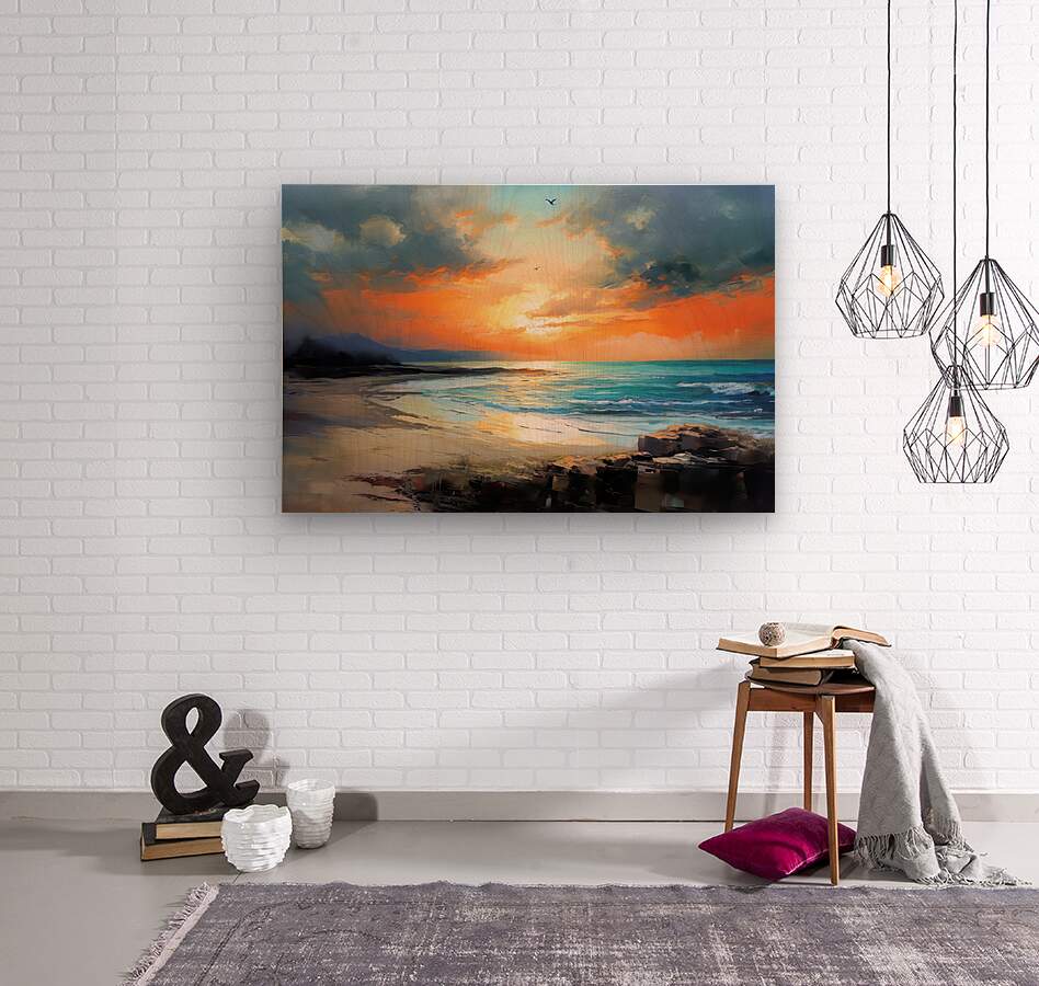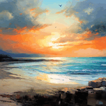 In this captivating piece of art, the artist masterfully captures the serene beauty that unfolds after a squall passes through, revealing a breathtaking beachscape. The painting depicts a stunning sunset scene where the ocean waves gently caress the sandy shore, reflecting the warm hues of the setting sun.