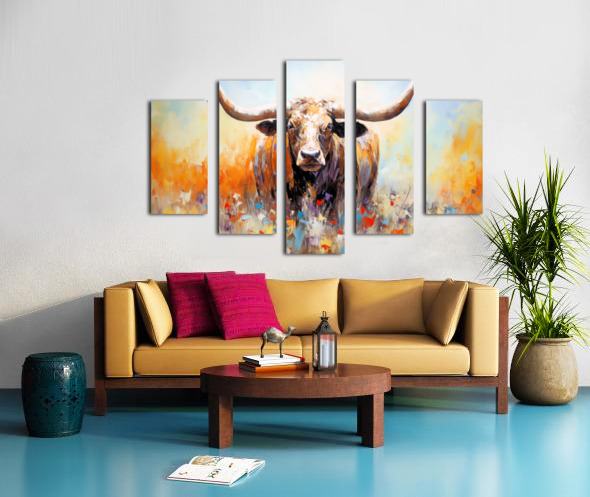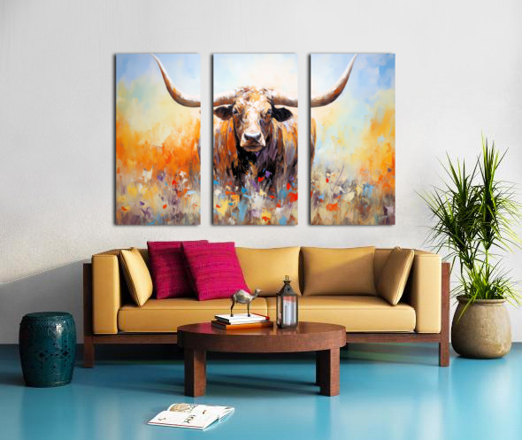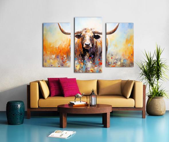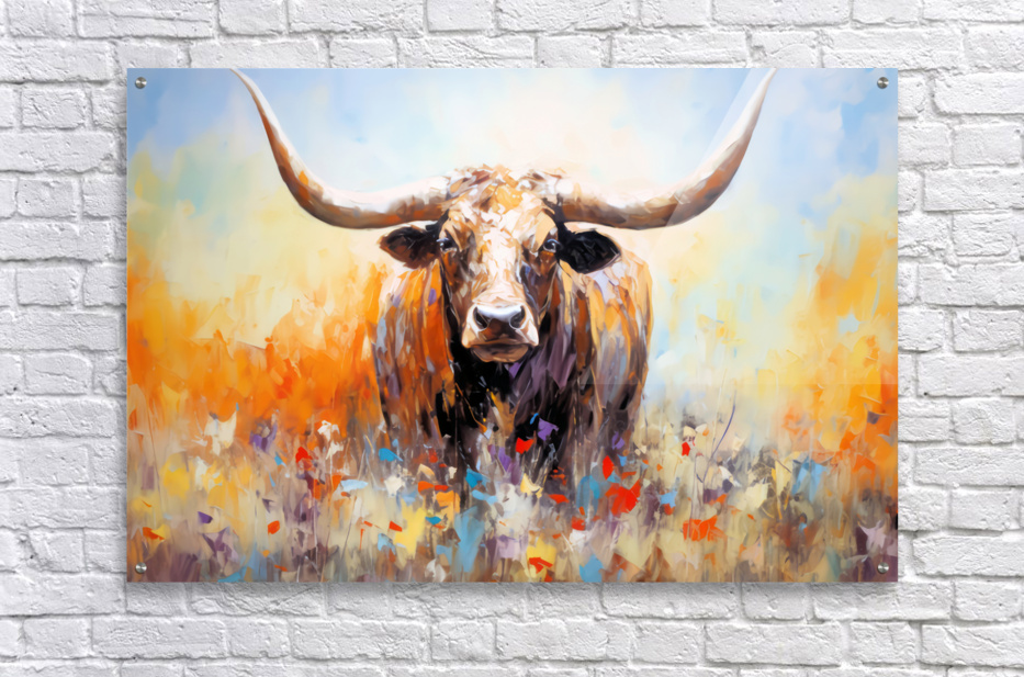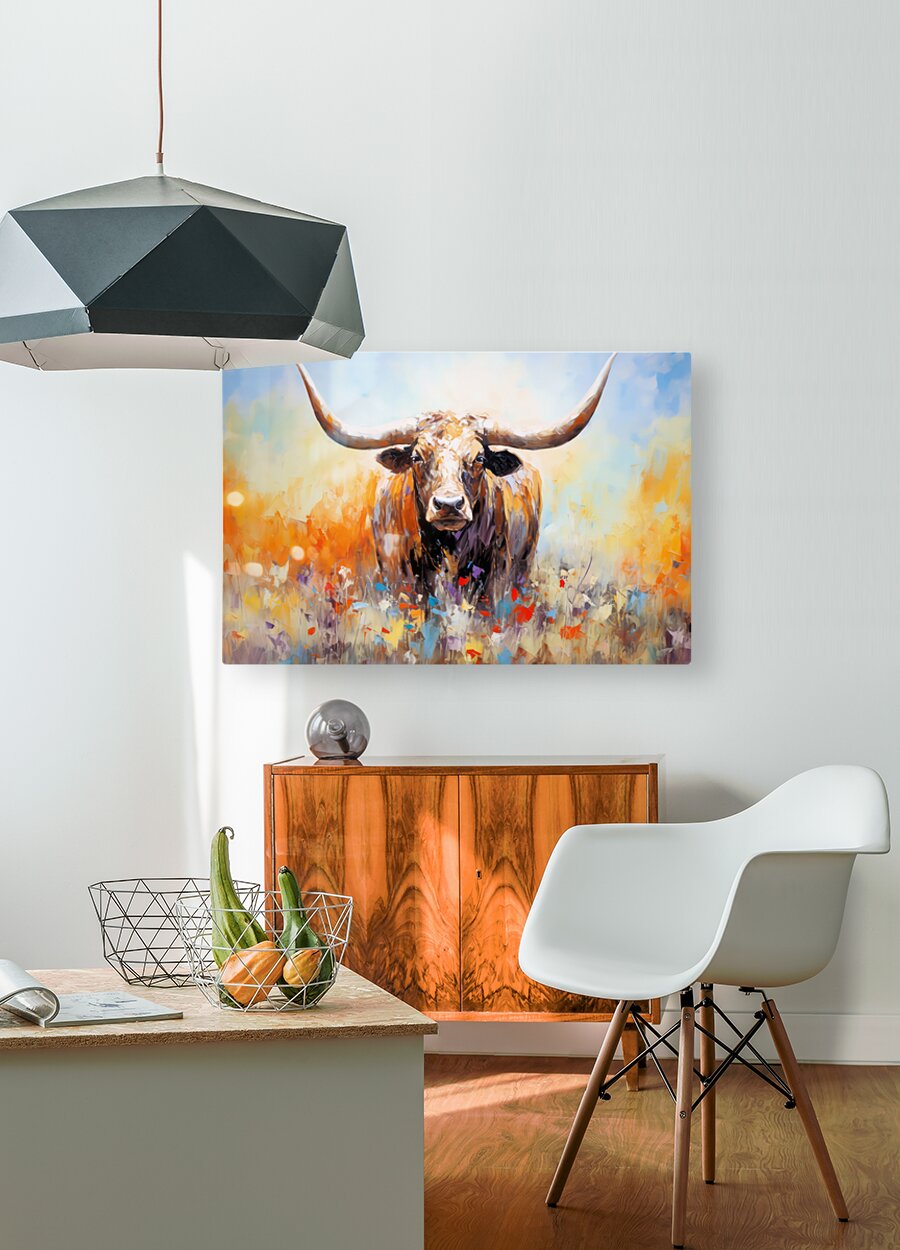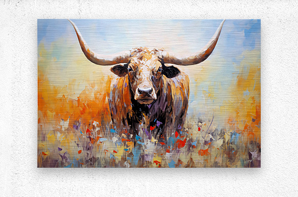 The bull, the focal point of the painting, stands with a majestic and imposing presence. Its long, curved horns frame its head like a regal crown. Its massive body exudes strength and resilience. But what truly captures your attention is its gaze—a motionless, unwavering stare fixed directly upon you. #AbstractArt #Art #Visual #LongHorn #Artbybuck