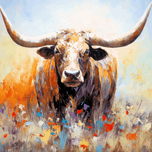 The bull, the focal point of the painting, stands with a majestic and imposing presence. Its long, curved horns frame its head like a regal crown. Its massive body exudes strength and resilience. But what truly captures your attention is its gaze—a motionless, unwavering stare fixed directly upon you. #AbstractArt #Art #Visual #LongHorn #Artbybuck