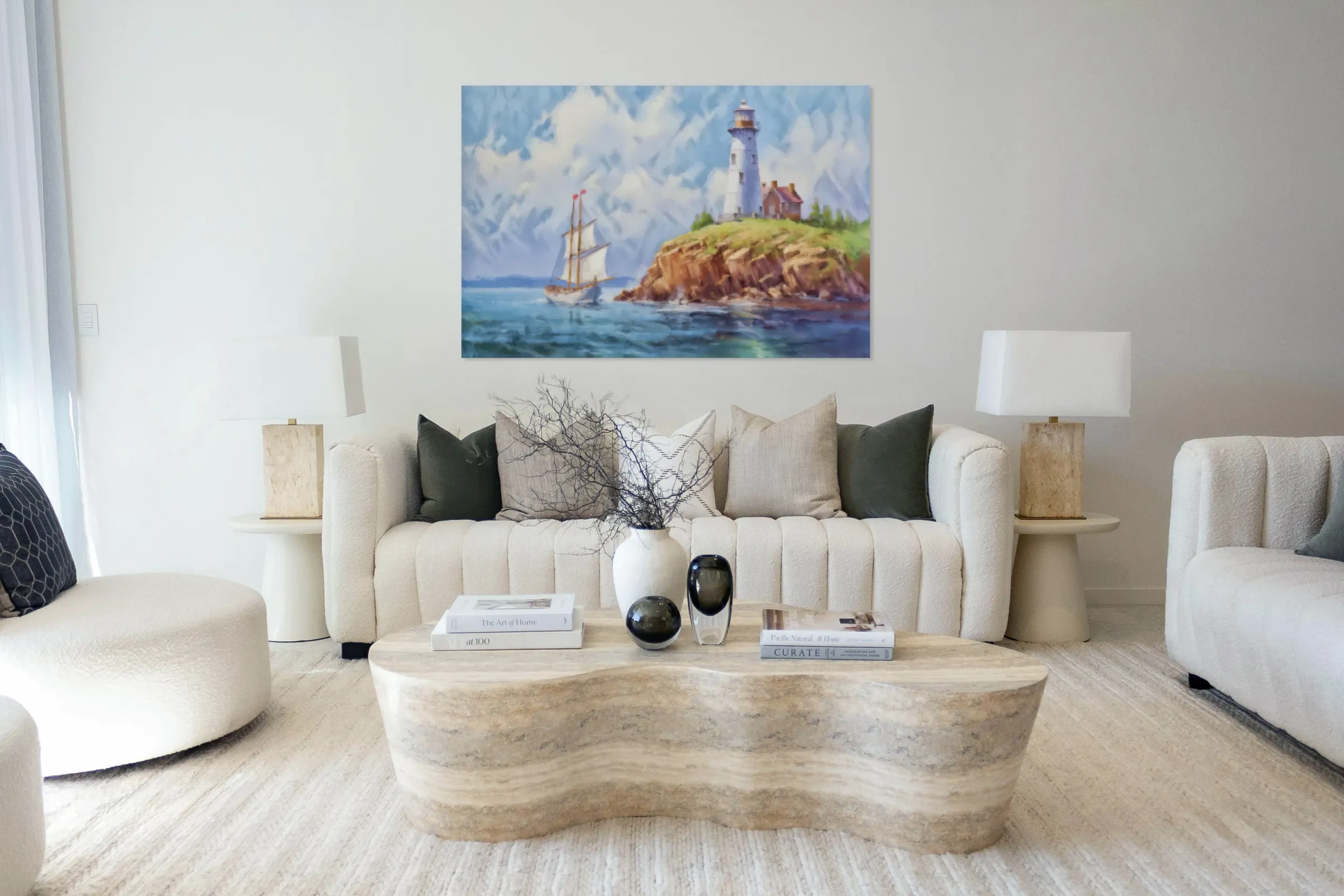 Sail into serenity with 'Affable Bluff.' This picturesque artwork featuring a sailboat, a bluff, and a charming lighthouse bathes you in a sense of happiness and peace. Let the sea and land unite in an affable embrace. #Seaside #CoastalCharm #Seascape #LighthouseScenery #WallArt #ContemporaryArt #ArtbyBuck