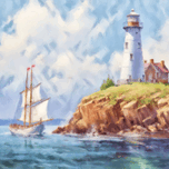 Sail into serenity with 'Affable Bluff.' This picturesque artwork featuring a sailboat, a bluff, and a charming lighthouse bathes you in a sen...[+]